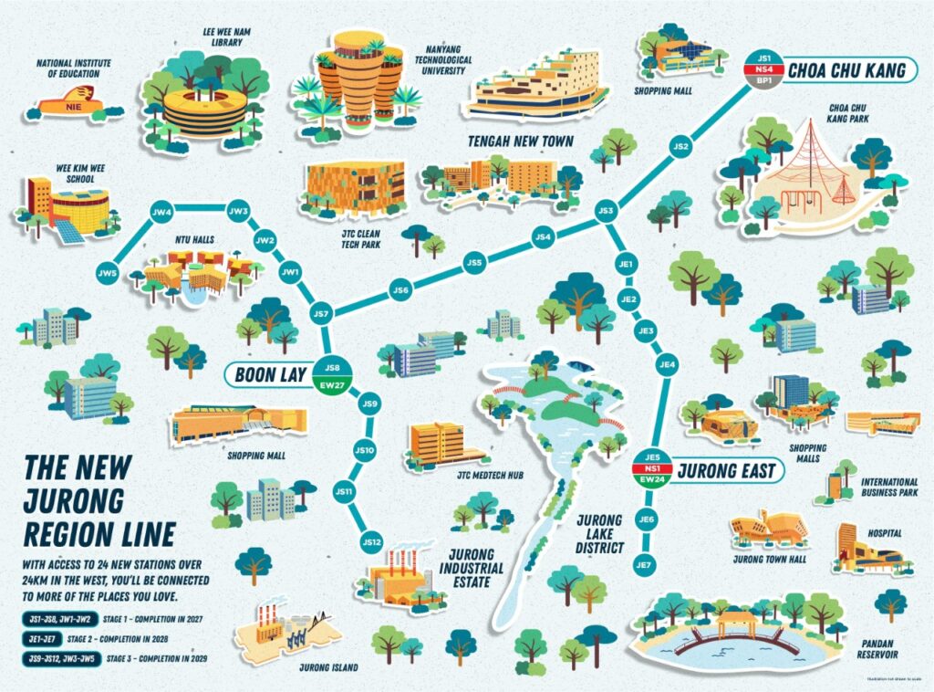 Copen Grand also enjoys excellent connectivity to Jurong Region Line (JRL) whereby there are three stations, namely Tengah (JS3), Hong Kah MRT (JS4) and Tengah Plantation (JE1), located within walking distance. This will be Singapore's latest addition to its vast network of MRT lines. When it is fully operational in 2029, the Jurong Region Line (JRL) will serve both existing and future development in the western part of Singapore. It will significantly improve the connectivity of the region and support the development of the Jurong area, which is set to be the largest commercial hub outside the Central Business District. Commuters can expect to be connected to key activity nodes in Jurong, such as the Jurong Industrial Estate, Jurong Innovation District, and the Nanyang Technological University (NTU).