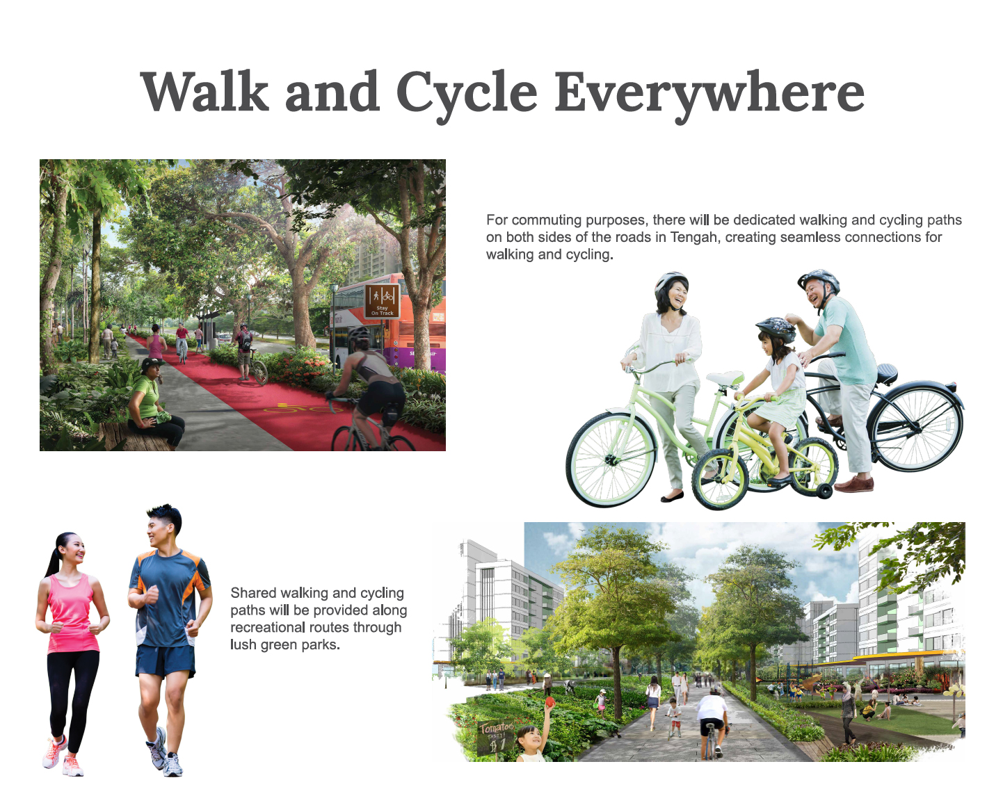 For commuting purposes, there will be dedicated walking and cycling paths on both sides of the roads in Tengah, creating seamless connections for walking and cycling. Shared walking and cycling paths will be provided along recreational routes through lush green parks.
